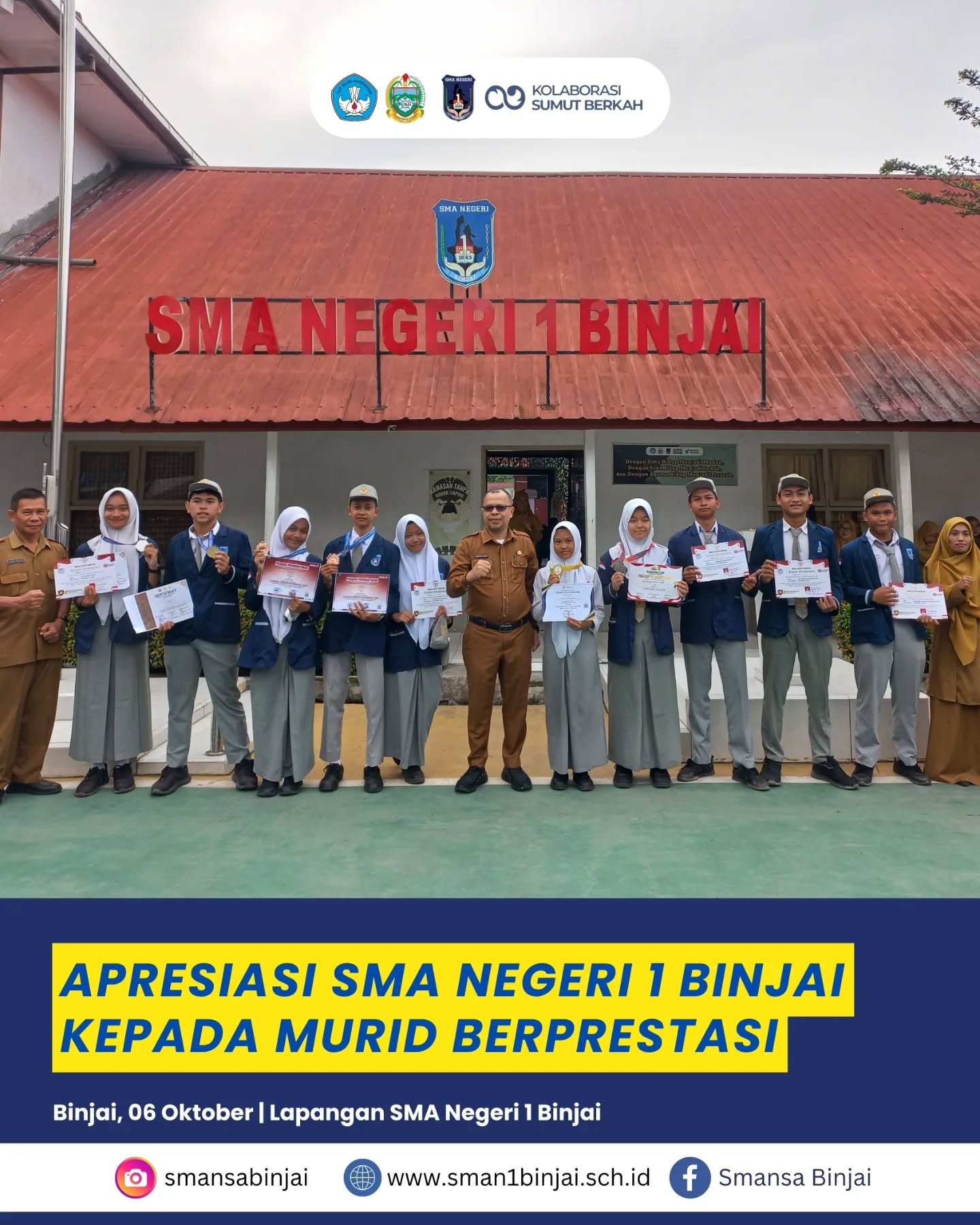 Kami memberikan apresiasi kepada murid-murid berprestasi SMA Negeri 1 Binjai! Ananda membuktikan bahwa usaha tak pernah mengkhianati hasil. Prestasi yang ananda raih adalah bukti nyata potensi hebat yang dimiliki generasi muda Binjai : 1. Zita Maxine Tanjung Kelas XI Sains 1, Juara 2 Kejuaraan Tapak Suci CUP IV Tahun 2025 Se-Kota Binjai 2. Ar Haby…